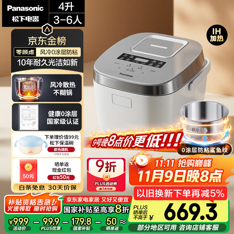 松下(Panasonic)Xtra零零煲全新0涂層電飯煲家用3-8個(gè)人無涂層不銹鋼內(nèi)IH電飯鍋4L容量智能煮飯鍋一級能效HFS153C